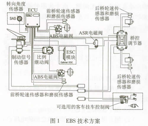 电子控制制动系统(EBS)是新开发的下一代制动系统产品,集成了防抱死系统(ABS)和常规制动系统于一体,通过电子控制来实施制动,是基于传统意义上的常规制动的创新,同时通过控制电磁阀来实现防抱死和防测滑功能,而且在此系统上可以拓展许多先进的电子控制功能,如可以拓展电子稳定性控制(ESC),自适应巡航控制(ACC)等功能。客车的电子控制制动系统由桥控调节器、ECU、ABS电磁阀、制动信号传感器、比例继动阀等零部件组成。
