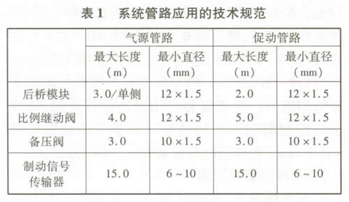 前桥电磁阀与制动气室之间的连接管应尽可能短,最长不要超过1.5 m,气管直径>9 mm。电磁阀排气口朝下,偏差±30°。并进行电磁阀的测试。