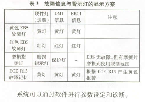 故障诊断的标定:仪表盘上有黄色警告灯,红色警告灯,磨损指示灯等提醒驾驶员EBS的状态。红灯亮,制动性能可能会减弱,黄灯亮,制动性能不会减弱,控制功能可能会关闭。