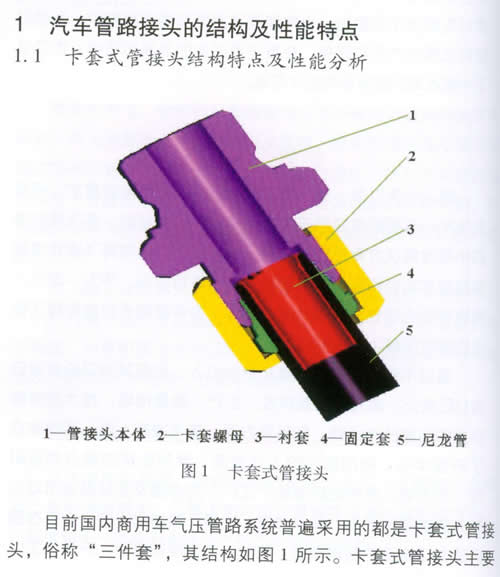 汽车制动系统是汽车非常重要的组成部分,而制动管接头是连接气制动系统各回路的关键部件,其性能的优劣会直接影响汽车管路的技术性能和整车的安全性能。在过去的几十年里,管路接头的改进与发展一直没能引起国内卡车厂商和用户的足够重视,国内商用车管路系统普遍采用的都是卡套式管接头,这种管接头在汽车总装配线上安装时需要手工拧紧,装配烦琐,且密封性能差。随着重型化、大吨位卡车安全技术要求的逐步提高,卡车制动管路越来越复杂,特别是车架纵梁内侧、驾驶室前围等空间狭小处,电气线束、制动管束等往往挤在一起,传统卡套式管接头在气密性、装配互换性等方面都难以满足设计要求。在此情况下,一种能够承受更大气压、密封性及装配性更好的新型快速管件应运而生。快插管接头改变了用扳手拧紧的传统装配方式,釆用软管与接头直接插接,不但节省了人工成本和设备损耗成本,还提高了装配效率、节省了装配空间;同时也解决了卡套式管接头与阀体等连接端局部存在偏长的现象,大大改善了管线的质量。