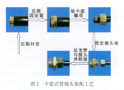⑶ 工艺性较差。卡套式管接头三件套在整车装配过程中,必须先将衬套、固定套用专用工装压入尼龙管内,将卡套螺母通过尼龙管与固定套联接,然后将卡套螺母与管接头进行螺纹联接。卡套式管件实物装配工艺过程如图2所示。