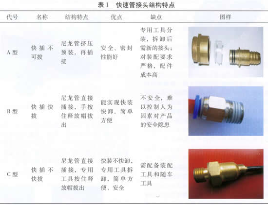 目前国内外市场用于气路系统的快速管接头主要有三种结构型式,如表1所示。