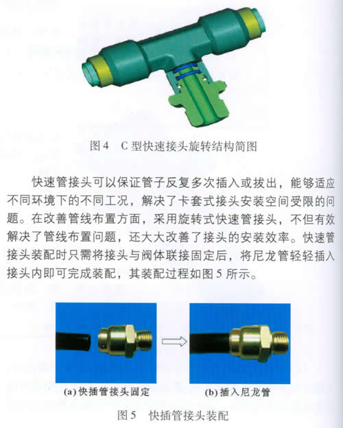 快速管接头与传统卡套式接头相比,由于其良好的密封性能和结构特点,不论是在底盘制动系统,还是在发动机低压油路上的应用,不仅提高产品性能,同时也改善现有汽车管路的装配方式,提高了工作效率,降低了综合成本。