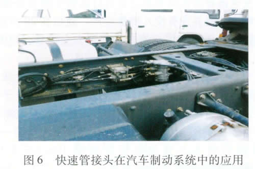 ⑴ 在商用车底盘气制动系统的应用。目前,我国中重型商用车采用的都是气制动系统,制动系统对汽车安全性起着决定作用。气制动系统中连接各种控制阀的管路称之为制动管路,而在各种控制阀和管路之间起联接作用的就是管路接头,采用何种管路接头,对制动系统起着关键的不可忽视的作用,因此管路接头的选用必须要考虑到以下要求:满足制动系统性能的要求;尽可能地降低制动管路的成本;安全可靠;便于拆、装。在气制动系统中采用快速管接头(图6)不仅满足了以上要求,还克服了现有卡套式接头存在的不足,使整车性能得以提高。