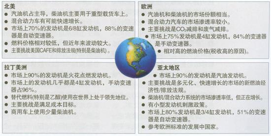 北美:北美市场的车辆主要使用汽油机,柴油机主要用于重型载货车。混合动力技术是一项相对新的技术,但混合动力车的数量有望增长。北美70%以上的汽车使用6缸或8缸发动机,约88%的汽车使用自动变速器。北美市场越来越多地使用六档自动变速器,六档自动变速器不但性能好,燃油经济性也好。以前大部分载货车和SUV使用的燃油成本较低,但是随着燃油价格走高,这种情况有所改变。