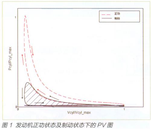 发动机缓速器的工作原理是在车辆制动过程中,通过控制排气门的运动规律来释放发动机气缸内的压缩空气,吸收发动机以及整车的惯性能量,从而实现制动。图1为发动机正功状态及制动状态下的PV,其中虚线为正功状态的缸内压力曲线,实线为典型的压缩释放缓速器制动状态的缸内压力曲线。在正功状态,活塞行至上止点后,缸内燃料燃烧使得气缸压力沿曲线升高,在膨胀冲程中气体对活塞做正功;在制动状态,燃油供给系统停止工作,活塞压缩气体到上止点附近,此时缓速器将排气门打开,压缩空气被释放,缸内压力迅速下降,气体带走的能量不返回活塞,从而实现制动。