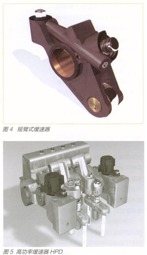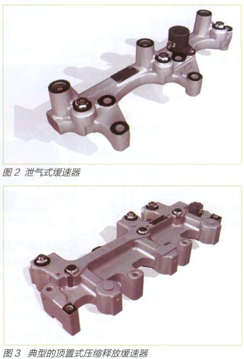 目前典型的发动机缓速器主要包括泄气式缓速器(Bleeder Brake)、压缩释放式缓速器(Compression Release Brake)。而压缩释放式缓速器又可分为顶置式压缩释放缓速器(Bolt-on Compression Release Brake),摇臂式压缩释放缓速器(Rocker Compression Release Brake)及高功率缓速器HPD(High Power Density Brake)等。