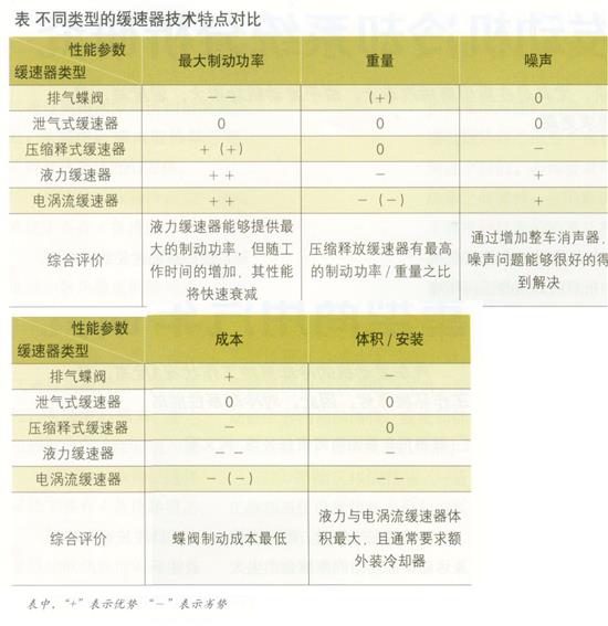 与传统的其他类型的辅助缓速器相比,如液力缓速器、电涡流缓速器、排气辅助制动器(俗称排气蝶阀),发动机缓速器具有高制动功率密度、高稳定性、高集成性且易保养等特点,发动机缓速器可以根据整车需要设置不同的制动力档位,提供可选的制动力矩,基本不需要额外消耗能量。发动机缓速器可大幅提高车辆下坡速度,提升运输效率,更省油;极大地降低制动片及轮胎磨损;对发动机及增压器无任何损坏,因此充分地了解它的性能并且合理、有效地加以利用是非常必要的。不同类型的缓速器技术特点对比见表。