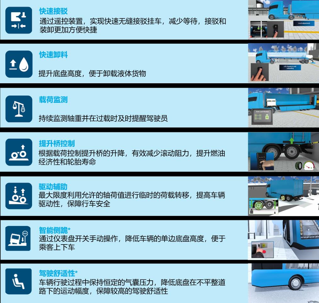 采埃孚领先的电控空气悬架系统通过优化悬架系统性能和智能的底盘高度调节,可帮助车队提高运营效率,提升安全性和舒适性,提供优异的货物保护,使车队的日常运营提升到一个全新的水平,并带来全方位的经济效益。