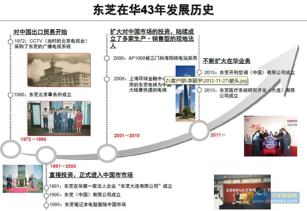 东芝在华发展的历史可追溯到1972年(见上图)。时至今日,东芝在华企业有87家,员工人数约35000人。东芝集团公布的数据显示,2013年其中国业务的规模高达820亿元。(点击上图可放大显示)