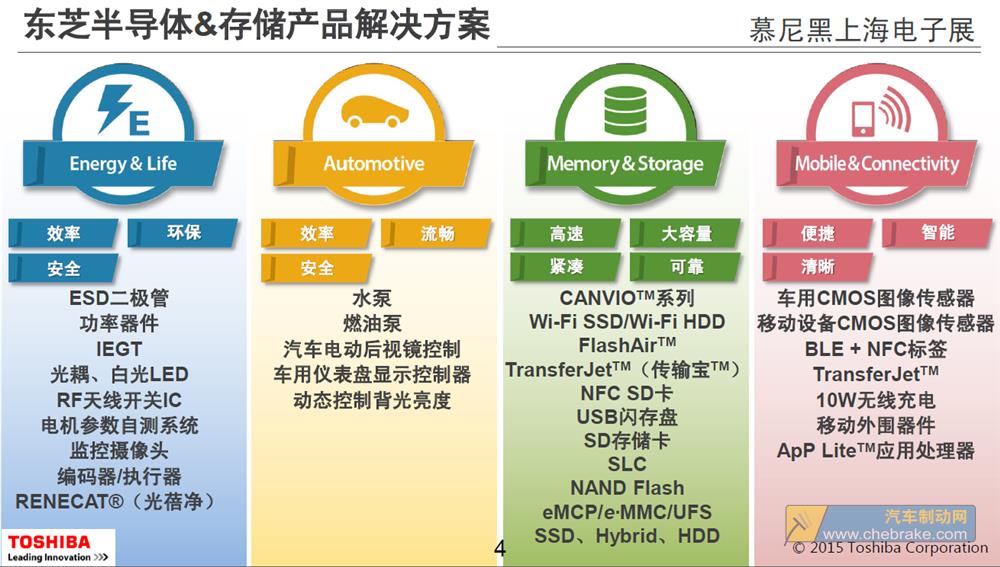 日本半导体制造商株式会社东芝(Toshiba)旗下东芝半导体&存储产品公司宣布,东芝携其强势产品和尖端技术参加了于2015年3月17日至19日在上海新国际博览中心举办的2015慕尼黑电子展。并于3月18日在展会同期举办新闻发布会,推出促进人类智慧生活的四大应用最新解决方案:Energy & Life、Automotive、Memory & Storage、Mobile & Connectivity。延续“智社会 人为本”的企业理念,致力于打造放心、安全、舒适的社会。