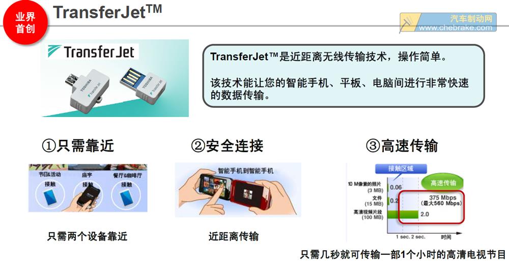 东芝的另一项业界首创技术—近距离高速无线传输技术TransferJetTM,能让您的智能手机、平板、电脑进行非常快速的数据传输。安全连接,操作简单,在有效距离3cm范围内,数据传输速度可达375Mbps,例如可以让一小时电视节目在最短时间内传输完毕。在如今追求4K/8K的高清大数据时代,无疑是一种全新高效的传输方式。从内置型芯片到消费级产品如USB/MicroUSB适配器、Lightning接口适配器以及TransferJet存储卡,产品线广泛,并提供相应的软件开发配套元件。