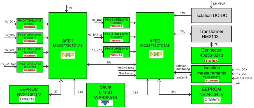 在新能源汽车产业加速向电动化、智能化转型的背景下,电池管理系统(BMS)正朝着高精度监测、模块化架构方向升级。作为BMS中的安全控制枢纽,HVBMS BJB(高压电池管理系统电池接线盒)承担着电池状态实时监控、故障诊断与保护控制等核心职责,对汽车电池安全至关重要。针对BMS设计需求,大联大世平推出以NXP MC33772C锂离子电池控制器IC为核心,辅以TOSHIBA光继电器TLX9160T、安森美onsemi EEPROM芯片NV24C64LV、Vishay电池分流器WSBS8518以及Molex连接器43650-0213为周边器件的HVBMS BJB方案。