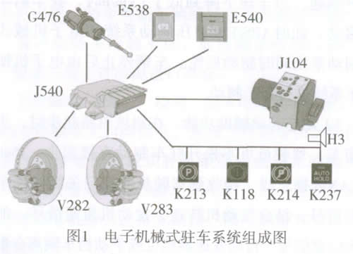系统主要由电子机械式驻车控制单元J540、ABS控制单元J104(通过CAN网络与J540交换相关的信号)、左后轮制动执行器(含制动电机V282)、右后轮制动执行器(含制动电机V283)、驻车制动装置指示灯K118、电子机械式驻车制动系统故障指示灯K214、电子机械式驻车制动器按钮E538和“AUTO HOLD”按钮E540等部件组成。其中,电子机械式驻车控制单元J540内还集成了一个传感器串,包括有横向加速度传感器、纵向加速度传感器以及行驶偏转传感器;在电子机械式驻车制动器按钮E538上装有相应的电子机械式驻车系统指示灯K213和警告蜂鸣器H3;“AUTO HOLD”按钮上也配有工作指示灯K237。另外,还有离合器位置传感器G476。如图1所示。