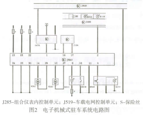 迈腾采用的电子控制机械式驻车系统,按功能可分为驻车功能、动态紧急制动功能、动态起动辅助功能和AUTO HOLD功能。其电路如图2所示。