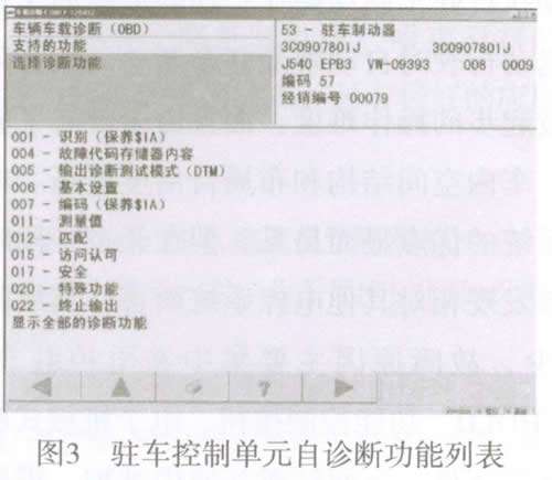 大众车系各电控单元均有功能强大的自诊断功能,可利用VAS5052A进入“引导性故障查询”或“车辆车载诊断”功能进行自诊断。前者按照诊断电脑的指引进行操作即可逐步排查故障;后者进入后,电控单元会提供如图3所示的多种诊断功能。进入“004”可读取故障码,再进入“011”查看测量值块的数据,“005”提供元件的“输出诊断测试模式”,进行故障元件与故障原因的初步判断。较常用到的还有“基本设置”、“编码”和“匹配”功能,在更换系统相关电控单元或传感器时,要视情况进行上述操作。