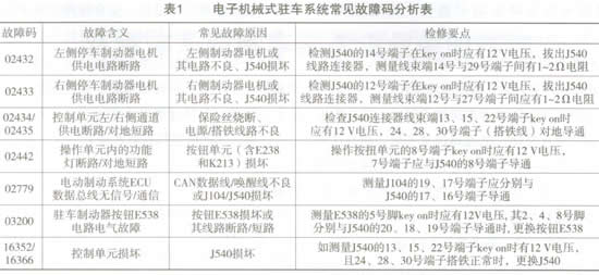 利用VAS5052A,选择“53-004”进入“驻车制动器”的故障诊断模块,即可渎取系统故障码。笔者总结了工作中常遇到的部分故障,并简析了常见原因及检修要点,见表1。
