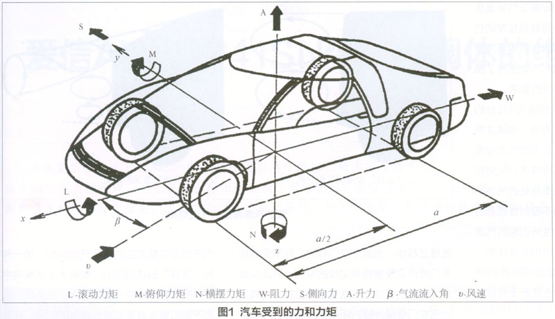 空气在汽车上的环流产生3个方向的力,继而产生固定在汽车上坐标系的3个坐标轴的力矩,汽车受到的力和力矩如图1所示。在纵向方向的力和阻力影响汽车的行驶功率,其外部的力和力矩则影响行驶状态和行驶安全性,尤其作用力是不对称的侧向风作用力的影响。影响汽车行驶状态和行驶安全的自身因素包括底盘、汽车重心、空气动力及驱动功率等。