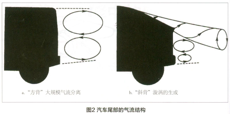 汽车在行驶的过程中,在汽车的尾部或在后保险杠后会形成一个涡流。图2表示汽车尾部可能发生的两种气流结构。第一种为“方背”形状(图2a),类似于上述案例中的中巴车尾部结构。其尾流大、压力低,气流不能沿着车身表面流过陡直的后角。压力的大小、产生漩涡的能量和频率受汽车的车速和车尾的宽度、高度的影响。若后背倾斜角度小一些,将会出现不同的气流形式,如“斜背”(图2b)、“溜背”,大多数双门车为“斜背”形状,汽车后部的表面空气压力明显低于周围的压力,上表面的低压将汽车侧面相对高压的空气向上吸,导致在C柱产生强烈的锥形漩涡,这些漩涡增加了这些气流附着于车体表面的可能性。