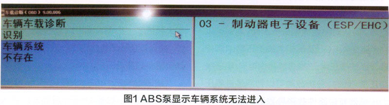 技师使用车辆诊断仪VAS5051B对控制单元检查故障码,经检查发现发动机电子设备中存在2个故障码,分别是故障码“49441,与ABS系统失去通讯”和“01281,车速传感器A范围/性能”;检查制动器电子设备(ABS泵),屏幕上显示车辆系统无法进入(图1);检查动力转向系统发现存在故障码“01317,仪表板控制单元J285检查故障代码存储器”;检查仪表板控制单元、数据总线诊断接口(网关)及电子中央电器系统,均发现存在故障码“01316,ABS控制单元失去通讯(静态)”。