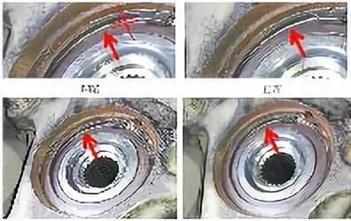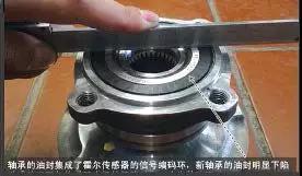 拆下右前半轴,露出轴承上的磁性编码环,仔细检查发现磁性编码环上有一处存在非常轻微的凹陷,大约1mm左右。如果不仔细检查,很容易被忽略。这个轻微的“凹陷”导致编码环与传感器之间的间隙变大,传感器不能稳定地感知到车轮的转动(图3)。