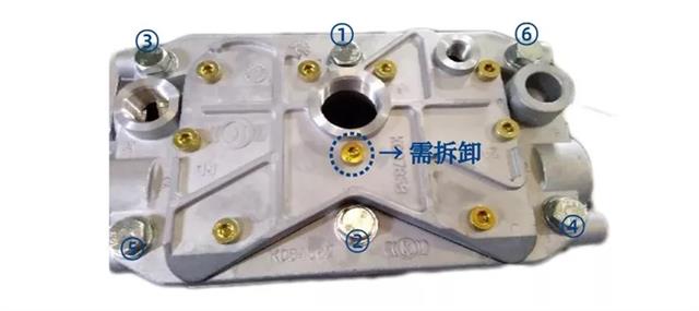 1,用工具将缸盖螺栓依次松开(注:有的产品要将缸盖中心内六角螺栓松开,见图1)