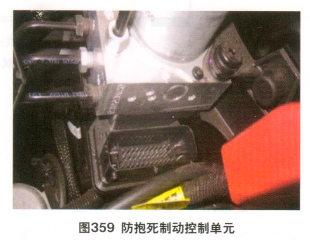 再次测量诊断插座6、14号端子之间的电阻,变为10Ω了,看来总线一定是有问题的。断开发动机控制单元的1号插接器,测量诊断插座6、14号端子到发动机控制单元X1/29、X1/43号端子的导通及绝缘性,发现这2条信号线都对搭铁短路。逐个断开总线上的各控制单元,在断到防抱死制动控制单元(图359)时,总线2条信号线对搭铁的绝缘性均恢复了正常,说明问题出在该控制单元内部。