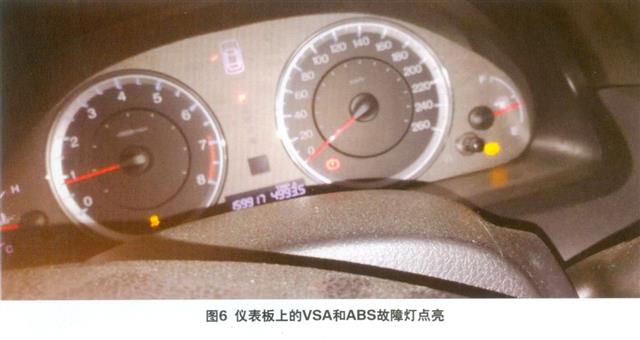 检查分析:维修人员接车后首先确认故障现象,发现该车仪表板上的车辆稳定辅助系统(VSA)和防抱死制动系统(ABS)故障灯同时点亮(图6) 与用户描述的一致。接下来维修人员使用故障诊断仪进行检测,读取到了反映VSA电磁阀故障的故障码。接着检查ABS总泵插接器,未见松动情况,而且故障码可以被清除,路试一段距离后,故障码也没有再次出现,所以怀疑是误报引发的故障灯点亮。
