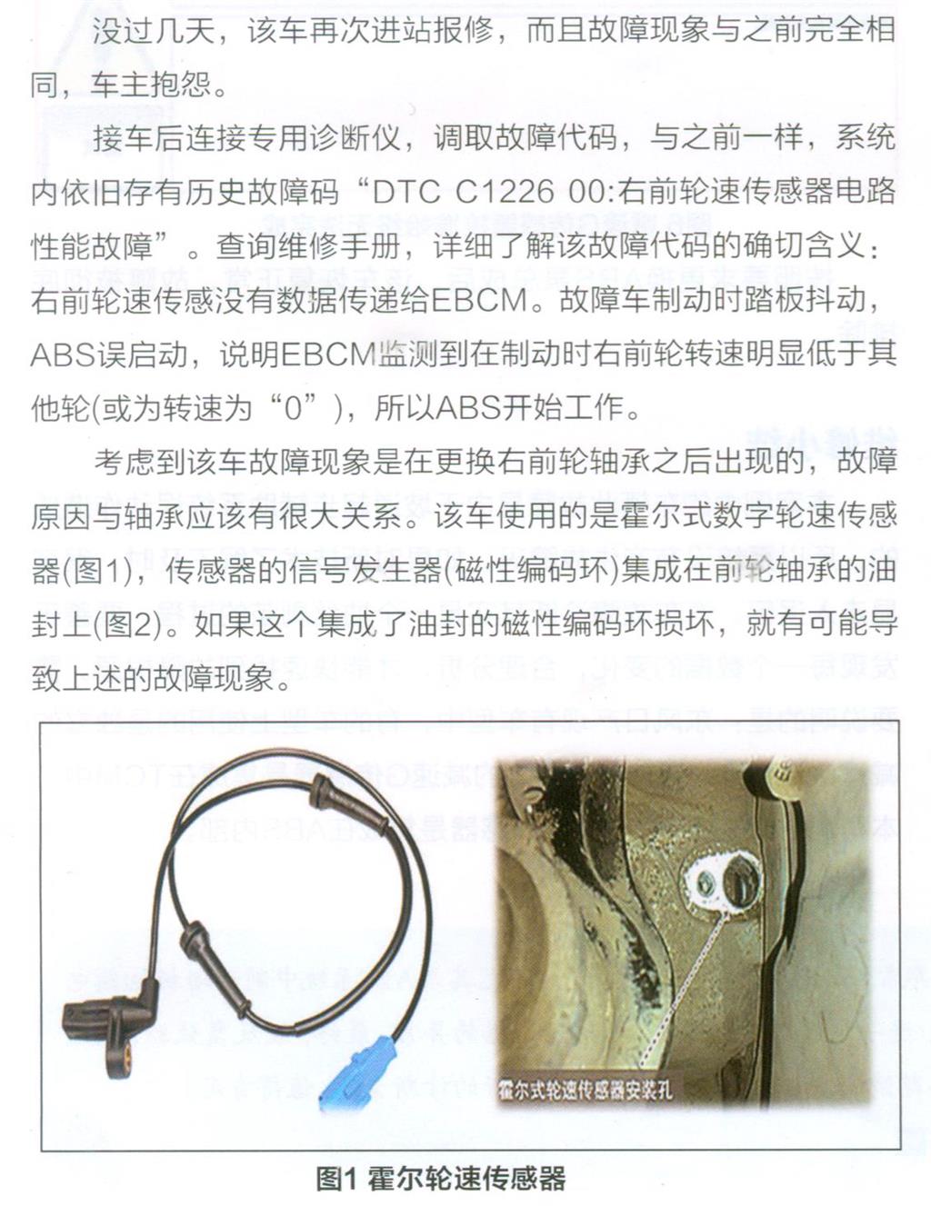 接车后,首先试车并验证故障现象,确实如车主所述,ABS指示灯常亮,且制动过程中ABS误启动。连接专用检测仪,发现系统存有历史故障码“DTC C1226 00:右前轮速传感器电路性能故障”。拆下右前轮轮速传感器并进行检测,未见异常。清除故障码后进行路试,故障现象消失,并交车。