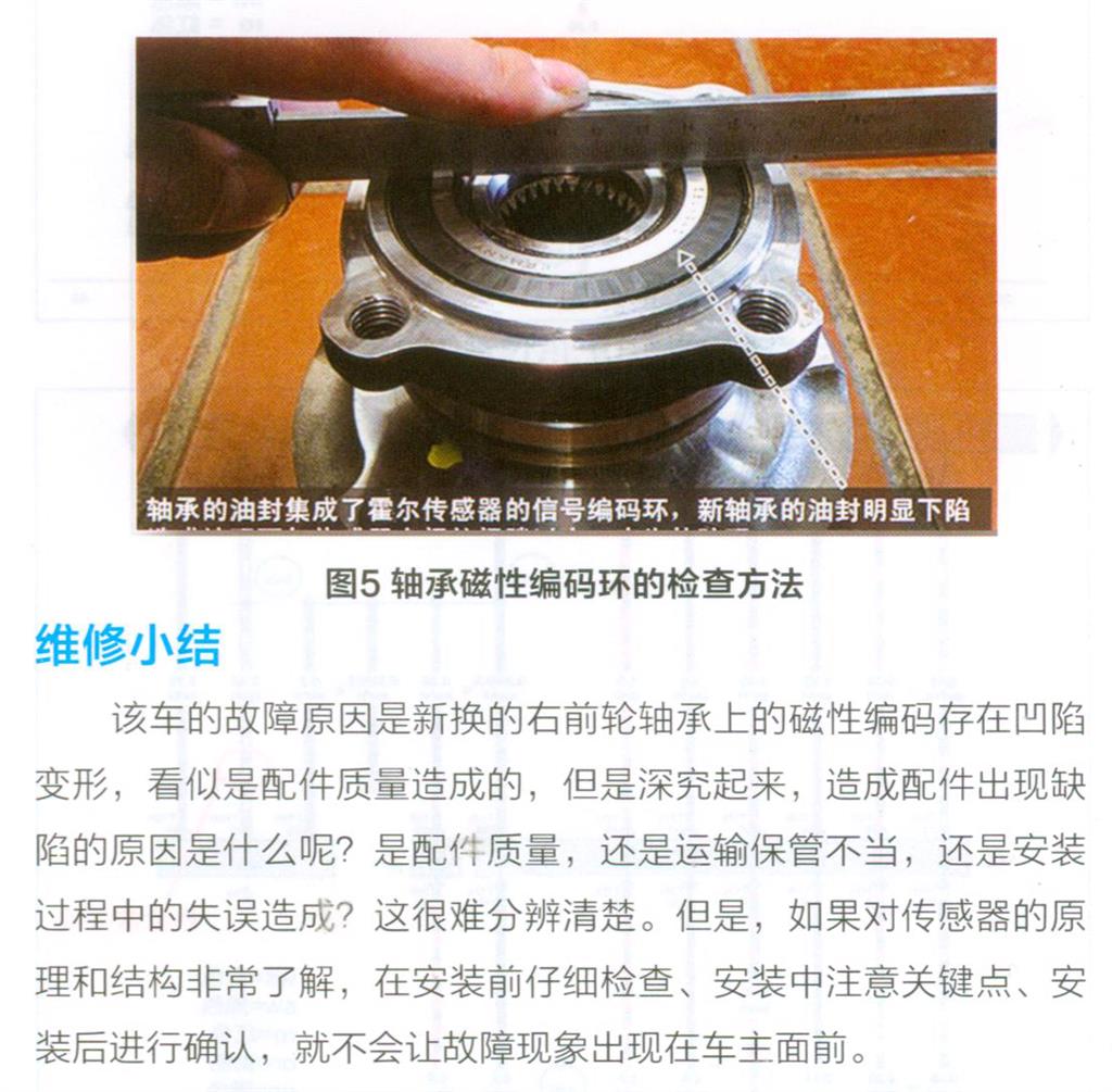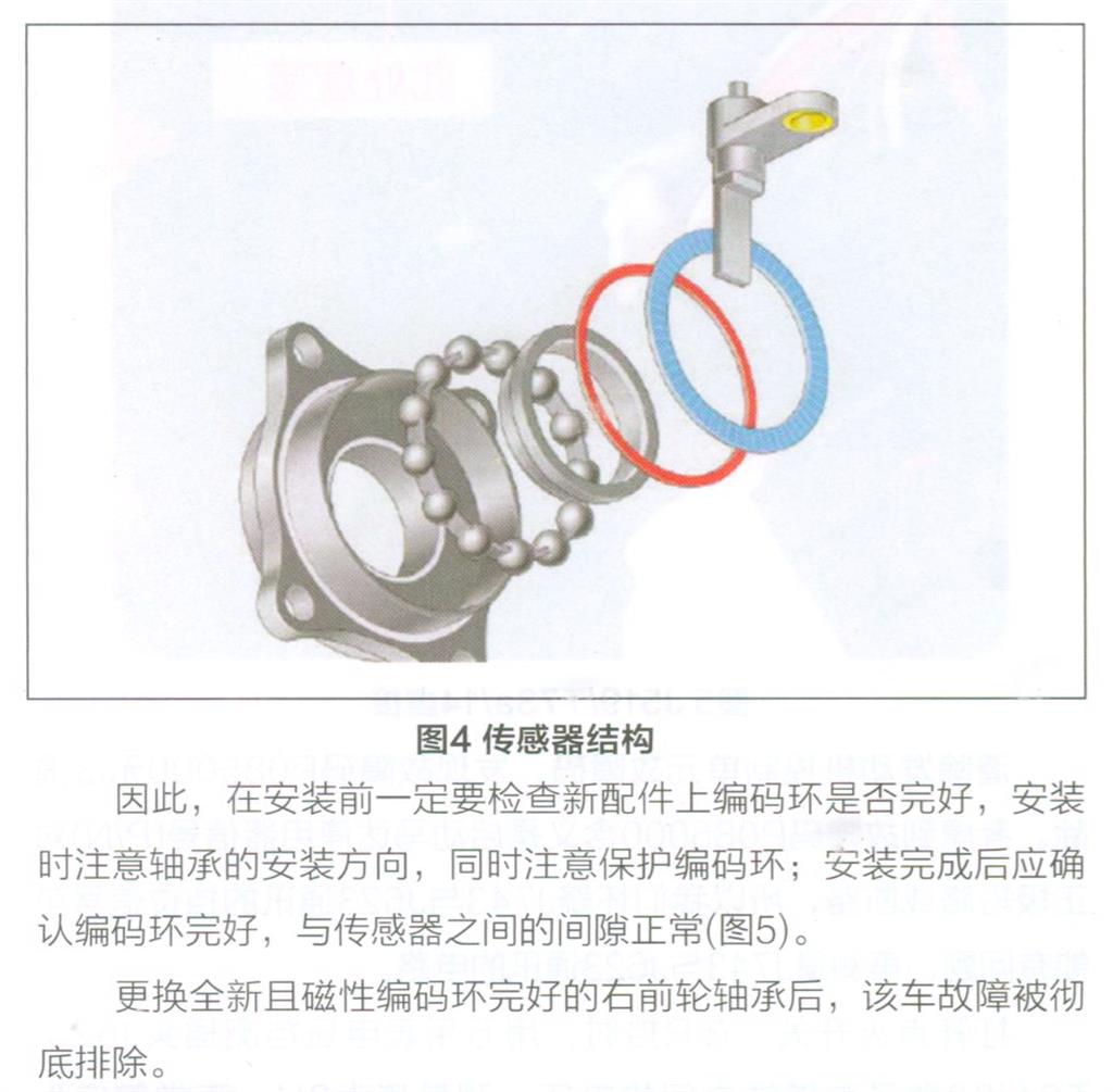 此车故障比较简单,由于该车是更换右前轮轴承后出现的,通过读取该车ABS系统故障码和数据流就可很快找到故障点。可以在汽车行驶时,通过数据流就可发现右前轮显示轮速与其他三个车轮不一致。主要是右前轮轮速传器与磁性编码环间隙过大导致信号不稳定,又由于右前轮信号与其他三个车轮信号不一致,所以点亮仪表板ABS故障指示灯。对于ABS系统来说,一旦ABS故障指示灯点亮,ABS系统将会停止工作,制动系统进入传统常规制动。