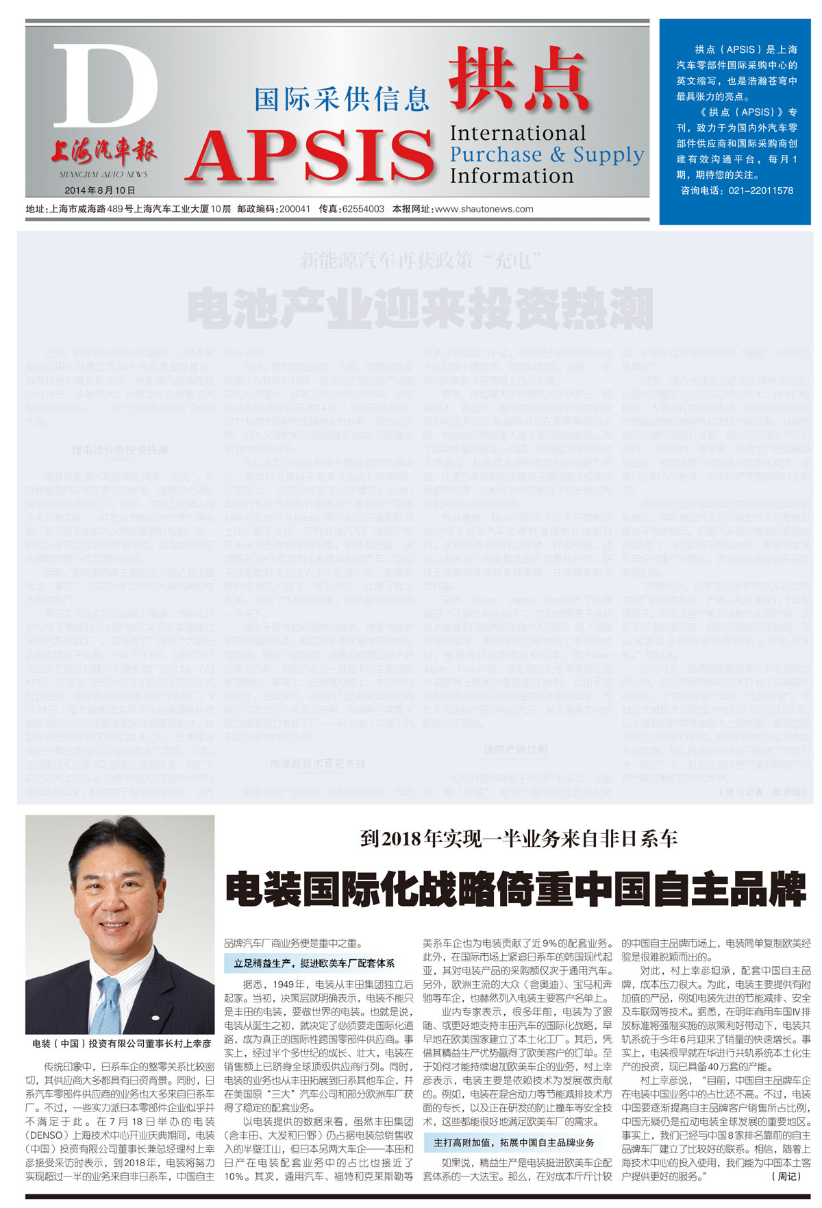 村上幸彦补充说,“也许有人认为中国车市刚刚经历了‘黄金十年’,很难持续高速增长。不过,我认为实现7%-8%年增长率是没有问题的。到2020年时,中国市场年新车销量将达到3000万辆。目前,中国自主品牌车企在电装中国业务中的占比还不高,不过,电装中国要逐渐提高自主品牌客户销售所占比例,中国无疑仍是拉动电装全球发展的重要地区。事实上,我们已经与中国8家排名靠前的自主品牌车厂建立了比较好的联系。相信,随着上海技术中心的投入使用,我们能为中国本土客户提供更好的服务。”