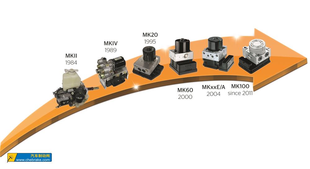 大陆集团的首个ABS产品 -- MKII -- 1984年在法兰克福 Rodelheim 工厂的组装线下线,这是大陆集团生产电子制动系统的开始。“MKII 是首款全集成式 ABS,并成为林肯大陆和福特 Scorpio 车的标配。当时它的确不轻,重11.5千克,但却能有效地预防一个或多个车轮的抱死”,Bietenbeck 表示。EBS 的重量随着产品更新换代而逐步减轻。1995年量产的 MK 20重仅2.7千克。纯 ABS 版 MK60重仅2千克,是2000年全球最轻的电子制动系统。ESC 版在此基础上仅增重0.3千克,使之成为当时全球最轻的 ESC 系统。目前的电子制动产品 MK 100 于2011年投产,其重量和尺寸比上一代产品又减小了约三分之一。“大陆集团的 MK 100采用模块化设计,产品系列涵盖摩托车 ABS,面向小型车的入门级 ABS,直到面向重型车的高性能、高端解决方案,这样制造商就能够按照自己的要求选择相应的系统。”Bietenbeck 说。