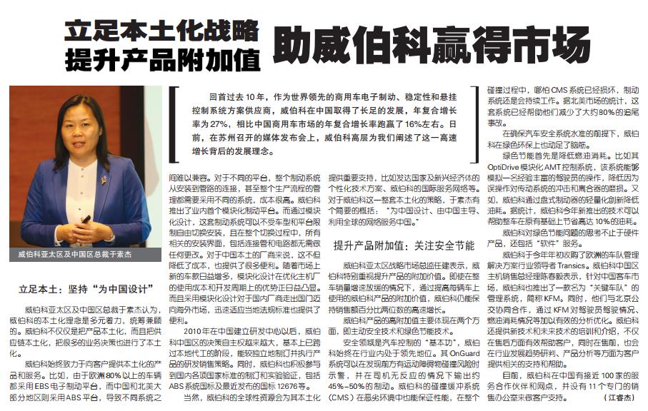 威伯科亚太区及中国区总裁于素杰认为,威伯科的本土化理念是多元着力,统筹兼顾的。威伯科不仅仅是把产品本土化,而且把供应链本土化,把很多的业务决策也进行了本土化。