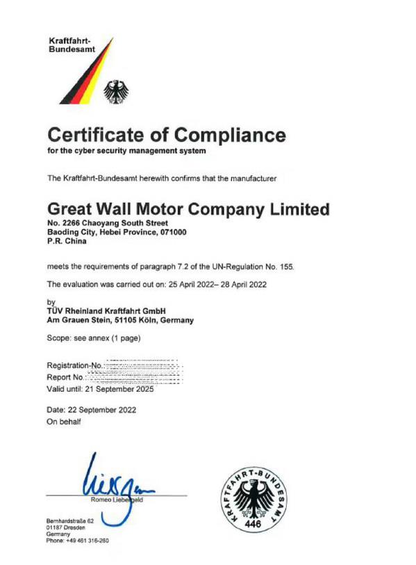 长城汽车十分重视网络安全,其网络安全体系经过2年多的不断完善及试运行,于2022年4月底,由TUV莱茵专家团队通过现场和线上同步协作,并在德国KBA和BSI(联邦信息安全局)的在线监督下完成审核,最终获得KBA颁发的UN-R155 CSMS符合性证书。