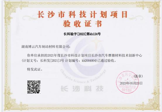 近日,湖南博云汽车制动材料有限公司收到长沙市科技局验收证书,公司承担的长沙市科技计划项目长沙市汽车摩擦材料技术创新中心通过验收。