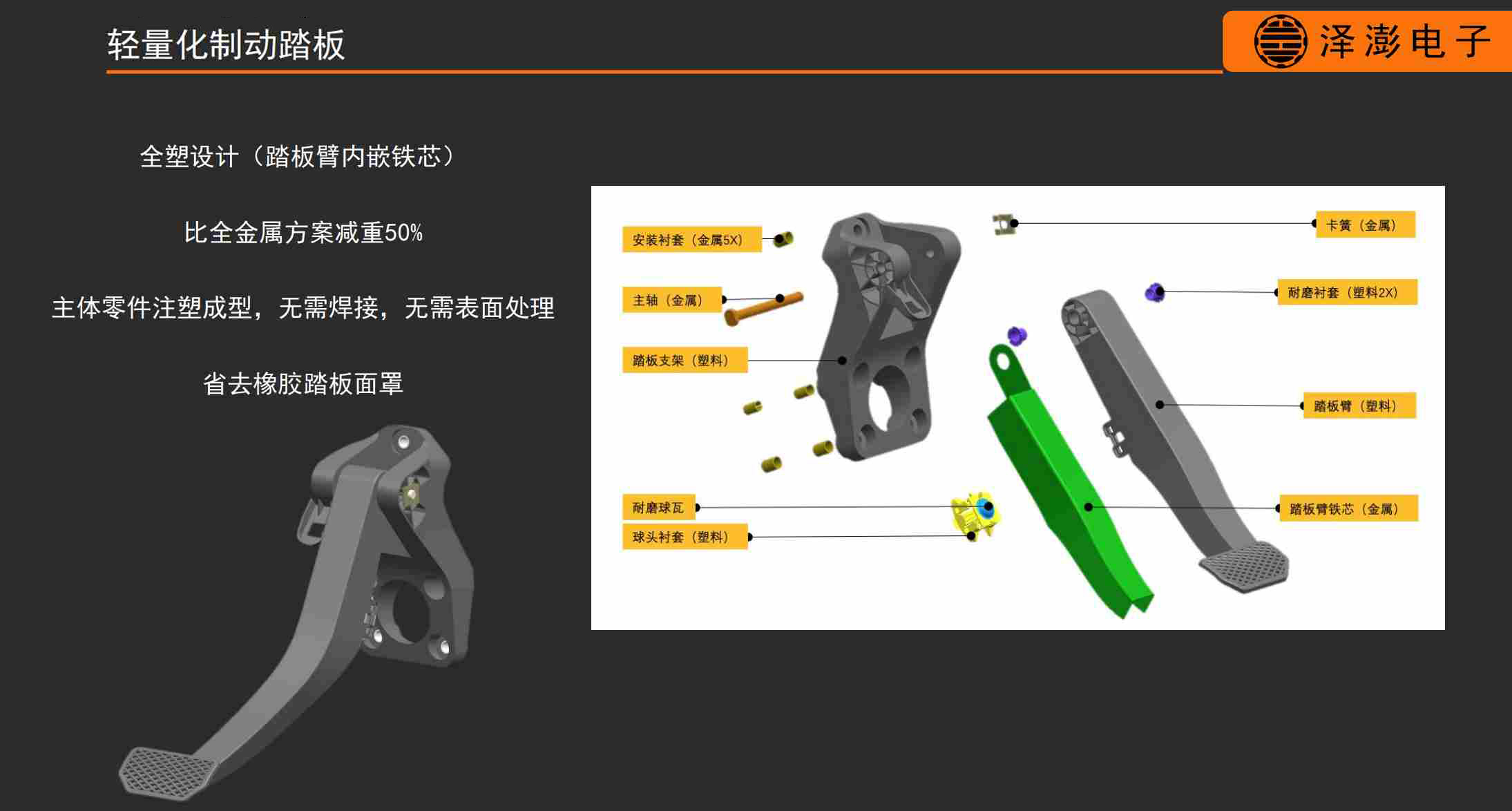 苏州泽澎成立于2020年3月,专业设计并生产全塑设计的轻量化汽车制动踏板、电子加速踏板、及各类位置传感器,公司聚焦底盘轻量化和底盘智能化方向。目前,公司产品已批量供应多家国内外汽车厂家。