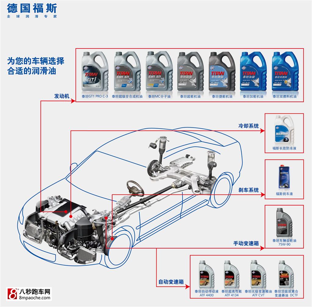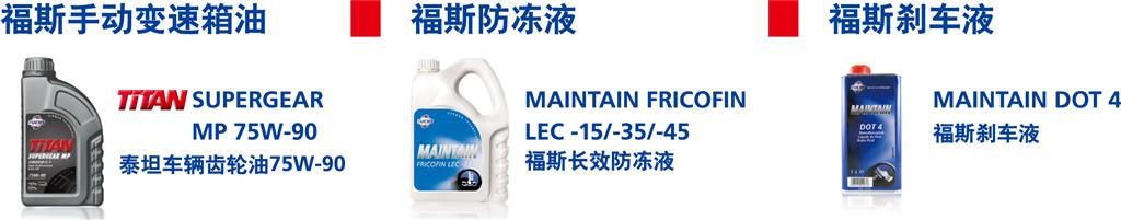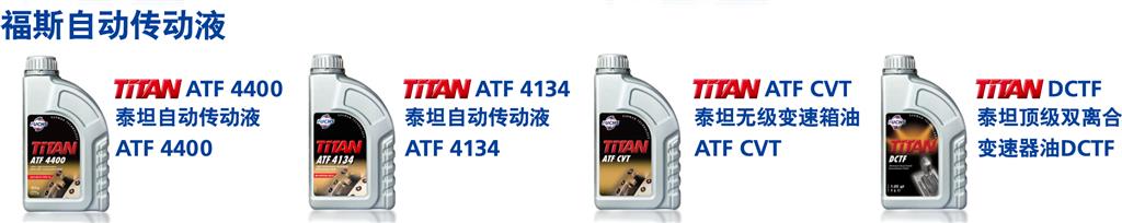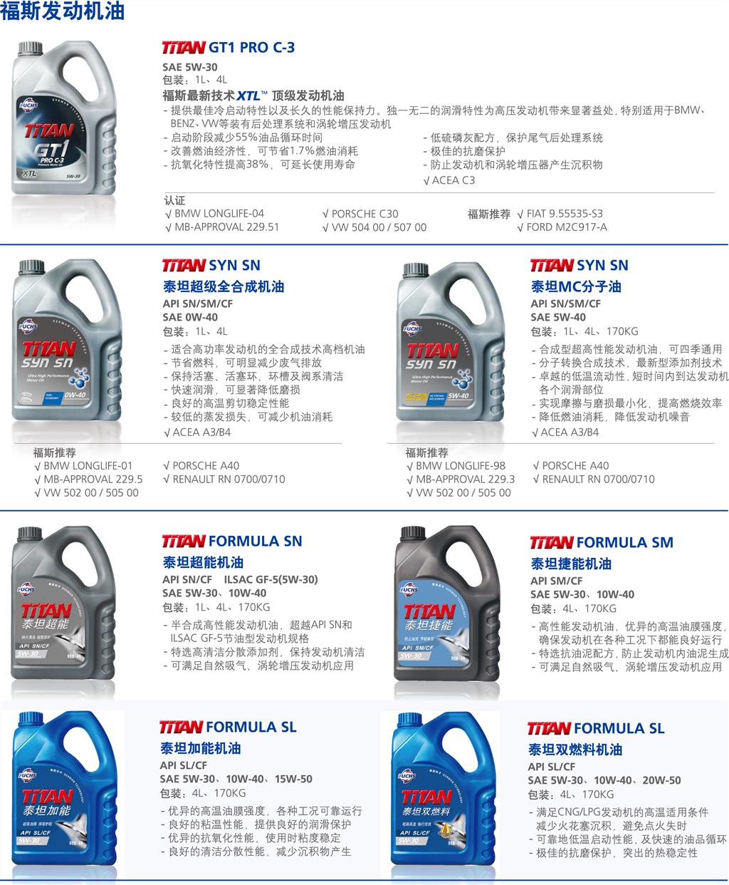 其中,福斯发动机油主要产品有:采用最新技术XTL的顶级机油TITAN GT1 PRO C-3、泰坦聚能全合成油TITAN SUPERSYN LONGLIFE、泰坦MC分子油TITAN SYN SN、泰坦超能机油TITAN FORMULA SN、泰坦捷能机油TITAN FORMULA SM、泰坦加能机油TITAN FORMULA SL,以及主打出租车市场的泰坦双燃料机油TITAN FORMULA SL。