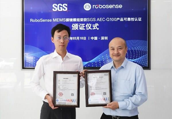 深圳2023年3月24日 /美通社/ -- 近日,国际公认的测试、检验和认证机构SGS与深圳市速腾聚创科技有限公司(以下简称:速腾聚创)成功举办"RoboSense MEMS振镜模组荣获SGS AEC-Q100产品可靠性认证"颁证仪式。速腾聚创CPO张腾、SGS中国互联与产品事业群总经理赵晖等双方重要嘉宾出席本次仪式。