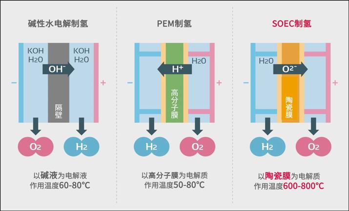 水产生氢的水电解方法有碱性水电解制氢、PEM(Polymer Electrolyte Membrane/固体高分子电解质膜)制氢等几种方式。由于水具备在温度越高越能在低电压下分解的性质,因此与在60℃左右反应的碱性水电解制氢、PEM制氢不同,SOEC所使用的陶瓷材料可在约700℃高温下反应,制氢所需的能耗也会对应削减。