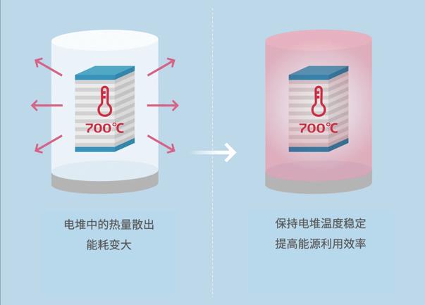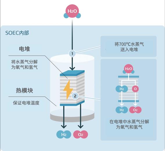 SOEC的电解模式是将该电堆放入用绝热材料包裹的高温机器“热模块”中,并向其中送入700℃高温的水蒸气来进行电解。