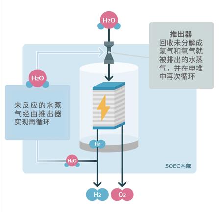 此外,为了解决排放未反应水蒸气造成的能源损失问题,电装SOEC配置了利用推出器的系统。 推出器是一种无需依赖泵等机械驱动器即可利用高压流体的能量吸入、排出低压流体的装置,可实现回收未分解成氢气和氧气就被排出的水蒸气,并在电堆中再次循环。并且因推出器耐高温、使用部件少,对应地可以延长SOEC的核心部件寿命,降低维护成本。