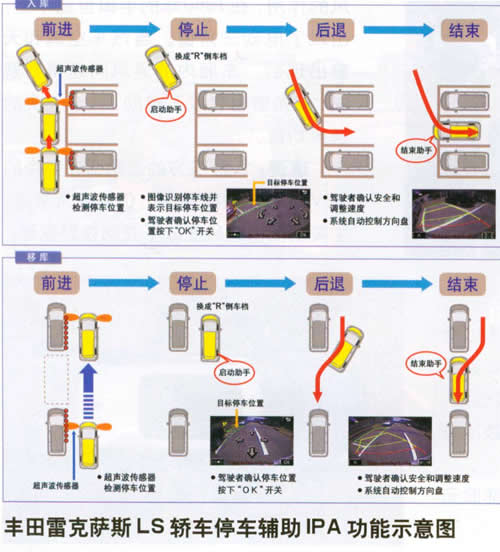 在2007年,丰田也在雷克萨斯系列的顶级轿车LS系列上安装了智能停车助手IPA(Intellignet Parking Assist)。这套系统使用电动助力转向(EPS),在汽车倒车停车时,方向盘可以自动操作,完成停车入位的动作。