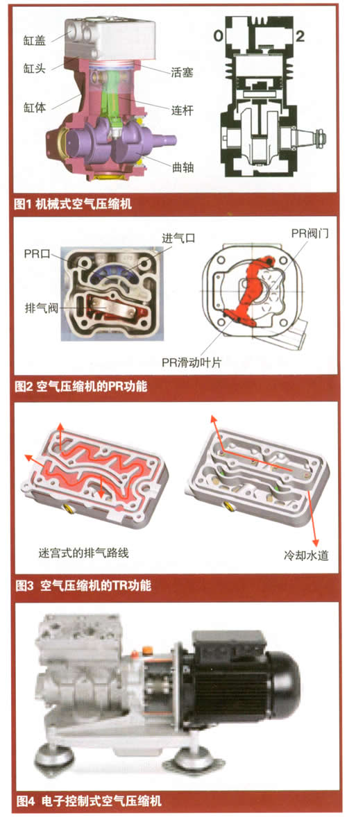 电子控制空气压缩机(图4)无需通过齿轮或带轮获取动力,仅用一根电源线启动自备的电动机即可实现工作运转。其功能特点如下: