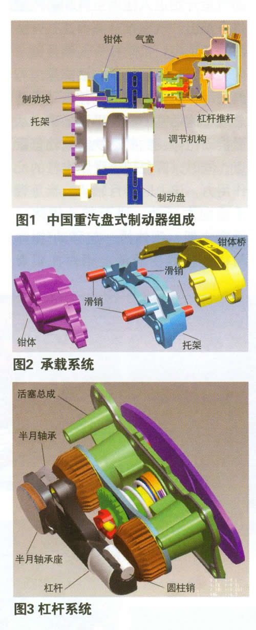 如图1所示,盘式制动器主要由气室、制动块、钳体、推杆、杠杆、调节机构、托架等部分组成。其中,制动盘与前轮毂用螺栓连成一体,为摩擦副的转动部分。制动块在托架的限位作用下,位于制动盘的两侧,为摩擦副的固定部分。制动气室为制动器的促动力发出部件。