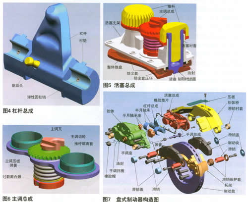 活塞总成由活塞支架、活塞衬套、活塞、推杆、主调总成、油封、防尘套、防尘套压环、整体推盘、轴用弹性挡圈等部件组成,如图5所示。推杆的齿轮与主调齿轮相啮合活塞通过螺纹(右旋)与推杆连接,并能在活塞支架中的活塞衬套内顺畅滑动;整体式推盘通过卡簧固定在两个活塞头部,其端部平面正对着制动块。其余部件如防尘套、防尘套压环、油封等为密封辅助件。