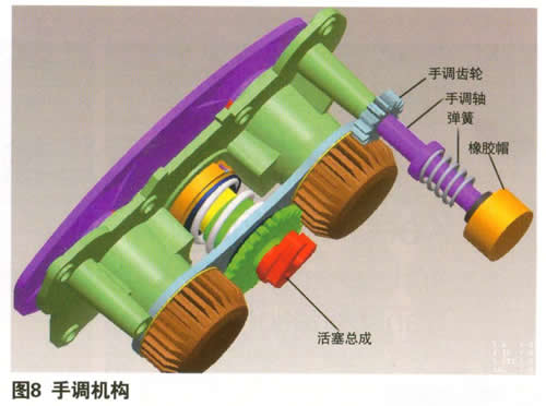 手调机构由手调齿轮、手调轴、弹簧、橡胶帽等部件组成,如图8所示。手调轴与手调齿轮过盈配合,壳带动手调齿轮转动,手调齿轮与一个推杆相啮合。手调轴另一端的橡胶帽取下后,即可用工具拧动手调轴,使手调齿轮带动活塞总成的轮系转动。顺时针转动手调轴使制动间隙减小,逆时针转动手调轴使制动间隙变大。