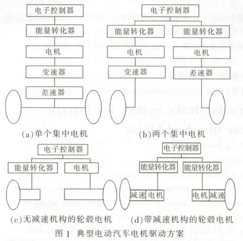 图1给出了各种典型电动汽车的电机驱动方案。对比分析可知,轮毂电机驱动型式电动汽车不需要变速器、差速器、球型万向节、半轴等部件,其电机(电机+减速机构)直接放在轮辋里面,从而使结构紧凑且车身内部空间利用率高,整车质心降低,车辆行驶稳定性提高。传统车辆内燃机输出能量的10%左右在向车轮传递过程中会损失掉,轮毂电机驱动型式电动汽车由于动力传动链短(或者直接驱动车轮),而且能够通过能源管理和动力系统控制策略优化驱动、制动力分配,因而驱动系统效率高,能源消耗降低,提高了车辆燃油经济性。