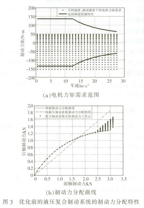 某后轮轮毂电机驱动电动汽车的整车部分设计参数如表2所列,工况参数如表3所列,该车纯液压制动系统的前后制动力分配系数为0.617。考虑车辆在不同车速和不同制动强度下对制动力的需求和满足情况,优化前的液压复合制动系统制动力分配特性如图3所示。图3a中两实线分别为电机在制动和驱动状态下随车速变化的峰值机械特性,阴影部分是电机在不同车速和不同制动强度下的实际力矩需求点。图3b中阴影部分为复合制动系统实际制动力工作点,在中小制动强度下,实际制动力工作点同理想制动力分配曲线重合。由图3可看出,由于未考虑轮毂电机的转矩特性,当轮毂电机作为辅助制动系统进行制动时,在中高速、大制动强度工况下电机驱动力矩不能满足需求,无法实现前、后制动力的理想分配;增大电机的峰值转矩特别是恒功率段的电机转矩,是实现理想制动力分配曲线的有效手段。