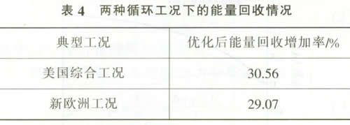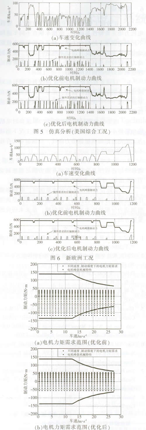 为了对制动能量回收情况进行分析,特选取两种典型循环工况(美国综合工况和新欧洲工况)进行仿真分析,通过对车速求导计算可提取出车辆制动过程,结合本文所述制动力分配策略可求出额外需求的后轴电机力大小,并与相应车速下的电机峰值特性对比,如图5和图6所示。由图5和图6可知,在两种循环工况下,制动时电机都工作在回馈制动模式,优化前该液压复合制动系统对电机制动转矩的利用不充分,而优化后电机制动转矩得到了更充分的利用,制动能量回收显著增加(表4)。
