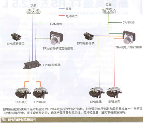 集成化的解决方案与传统EPB系统最大的不同在于其系统结构。在功能方面,EPBi与EPB相同,驾驶者根本感觉不到两个系统的差别。图2为两个系统结构的比较。